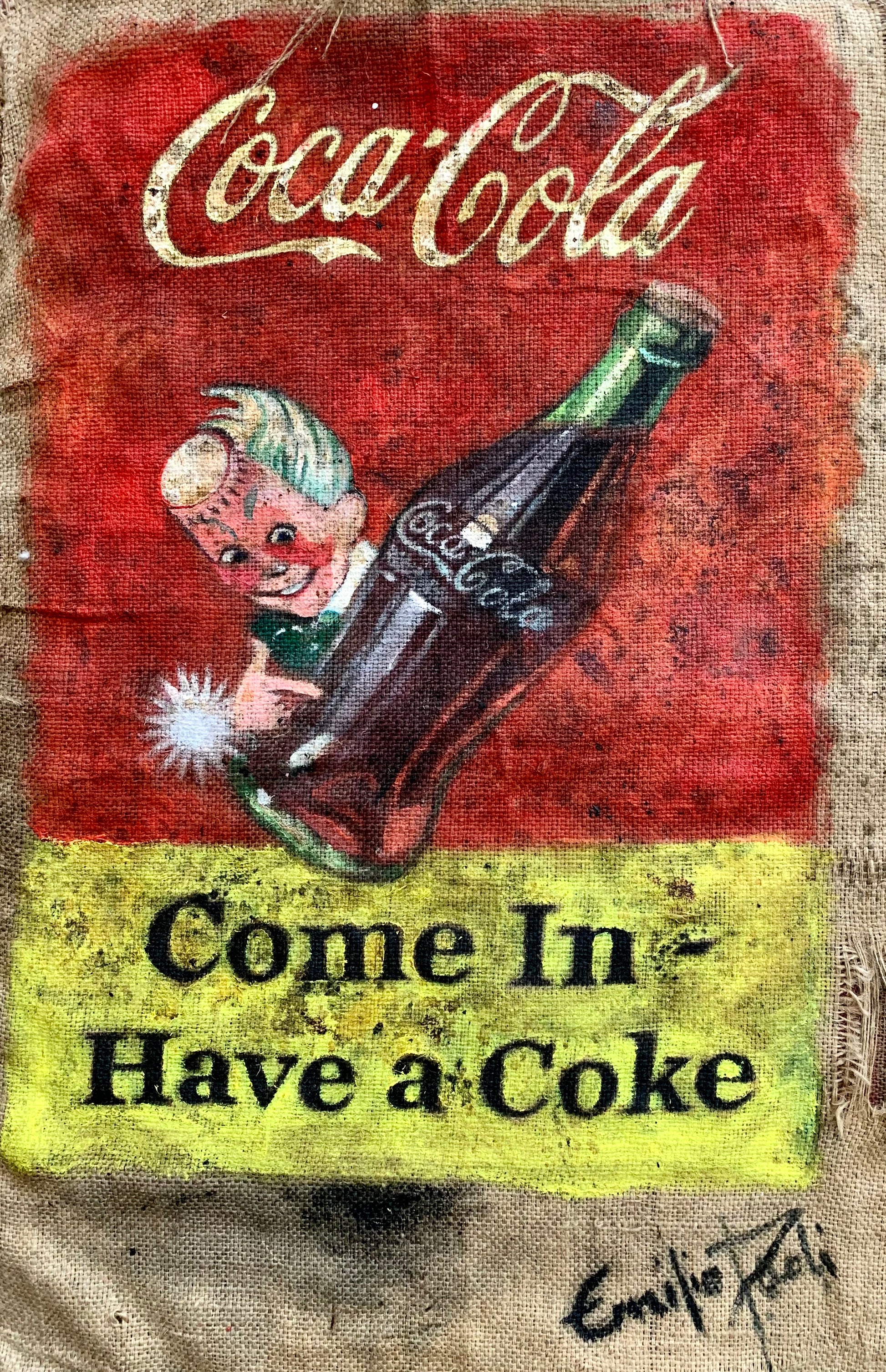 Tecnica mista su sacco di caffè antico